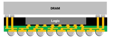 InFO-PoP package where a 3D stack of DRAM is laid over FC on substrate logic chip without the use of interposer. The signals of the top DRAM layer are passed through-InFO Vias (TIVs) to the high density RDL layer.